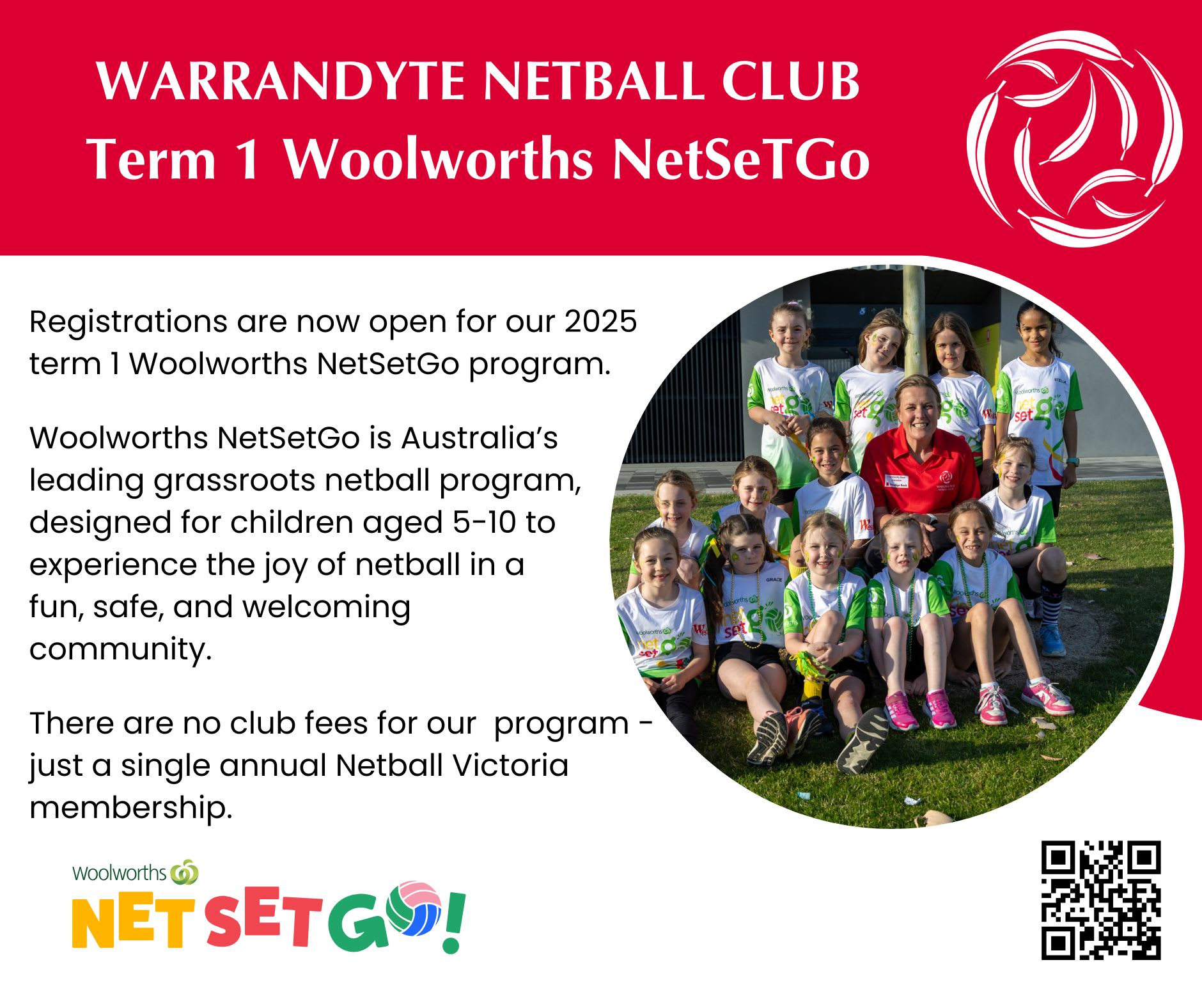 Woolworths NetSetGO is Australia’s leading grassroots netball program, designed for children aged 5 to 10. It’s how most kids in Warrandyte start their sporting journey, and it’s the pathway into junior competition at our club.
