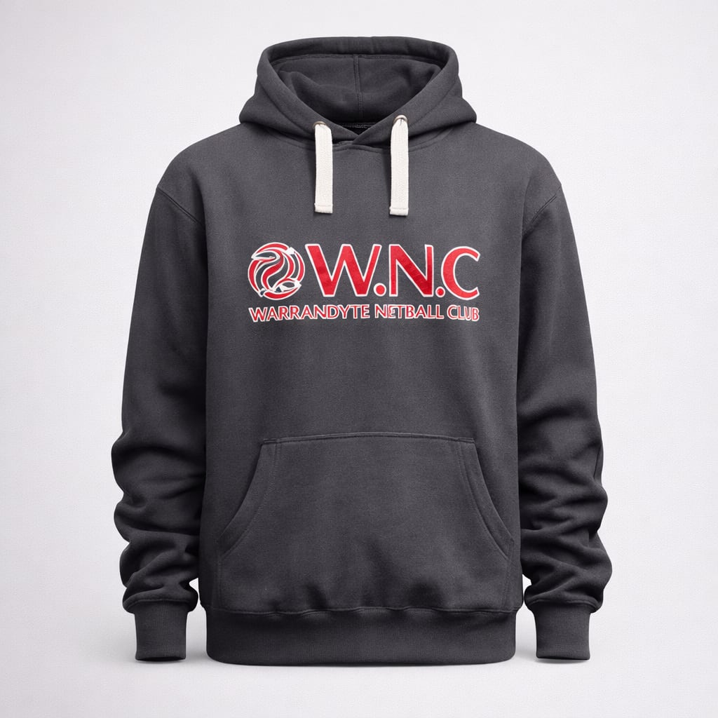 The official Warrandyte Netball Club hoodie is a staple piece of WNC gear. Featuring the WNC logo and “Warrandyte Netball Club” on the front chest, it comes in two colours: light grey and dark grey, both with a classic drawstring hood and front kangaroo pocket.