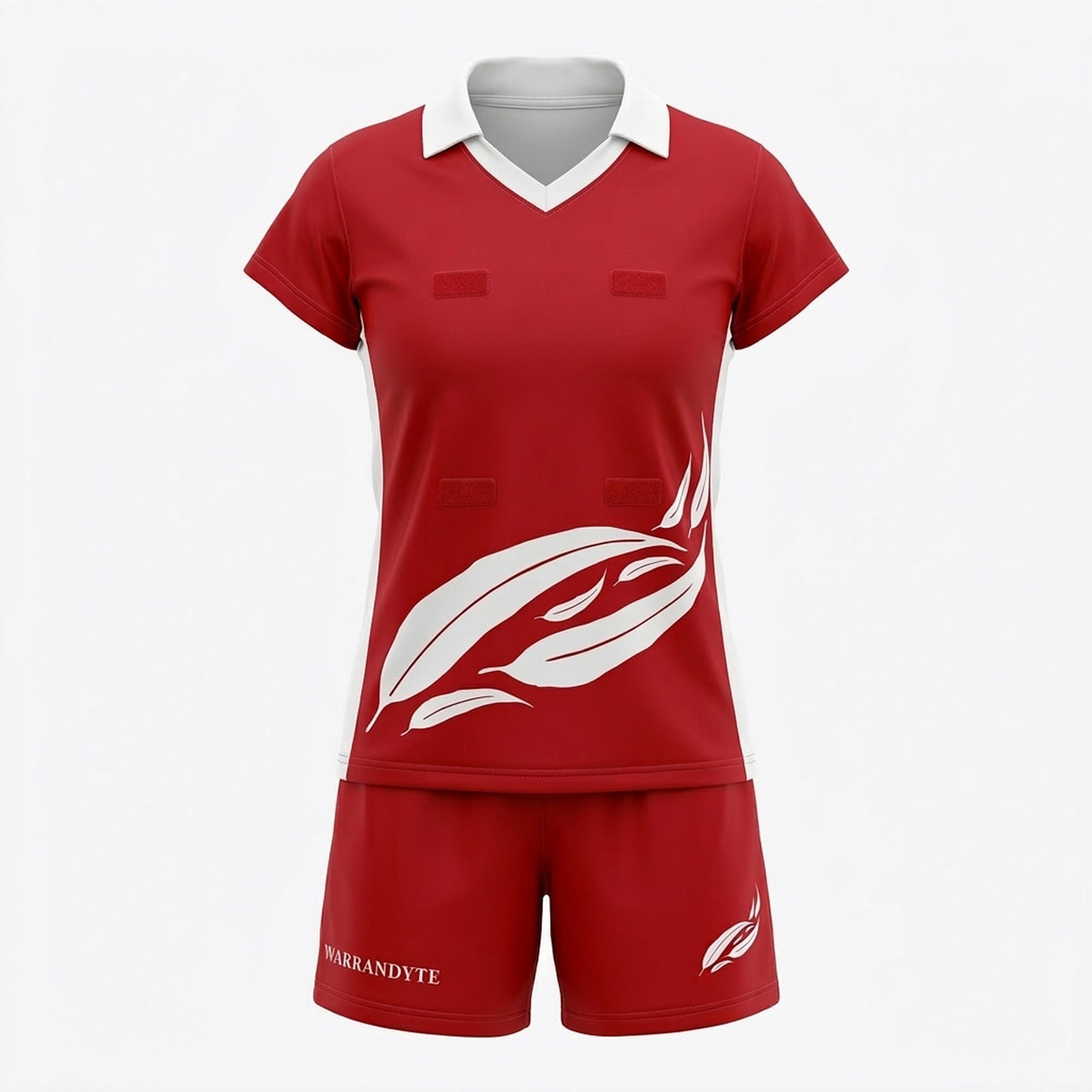 In WNC red and white with a white collar and v-neck, the polo features the Warrandyte leaf logo across the body and sides. Lightweight and breathable for on-court use.